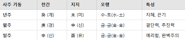 - 금(金)이 강하여 논리적이고 냉철한 판단력이 뛰어남.